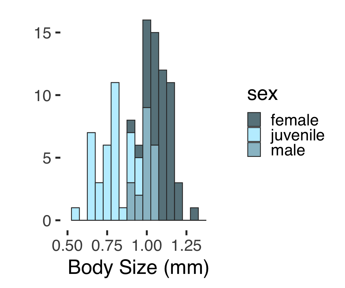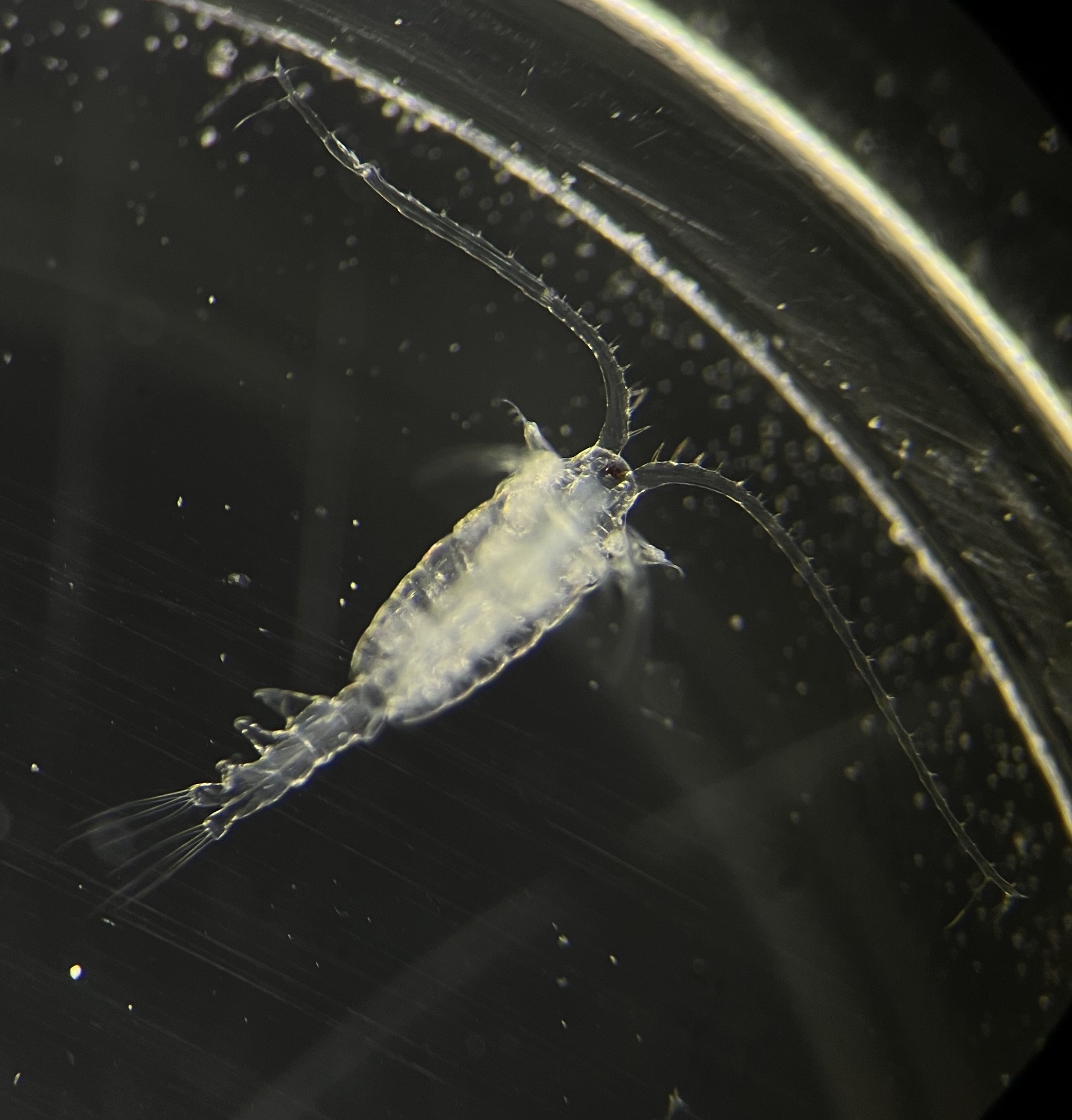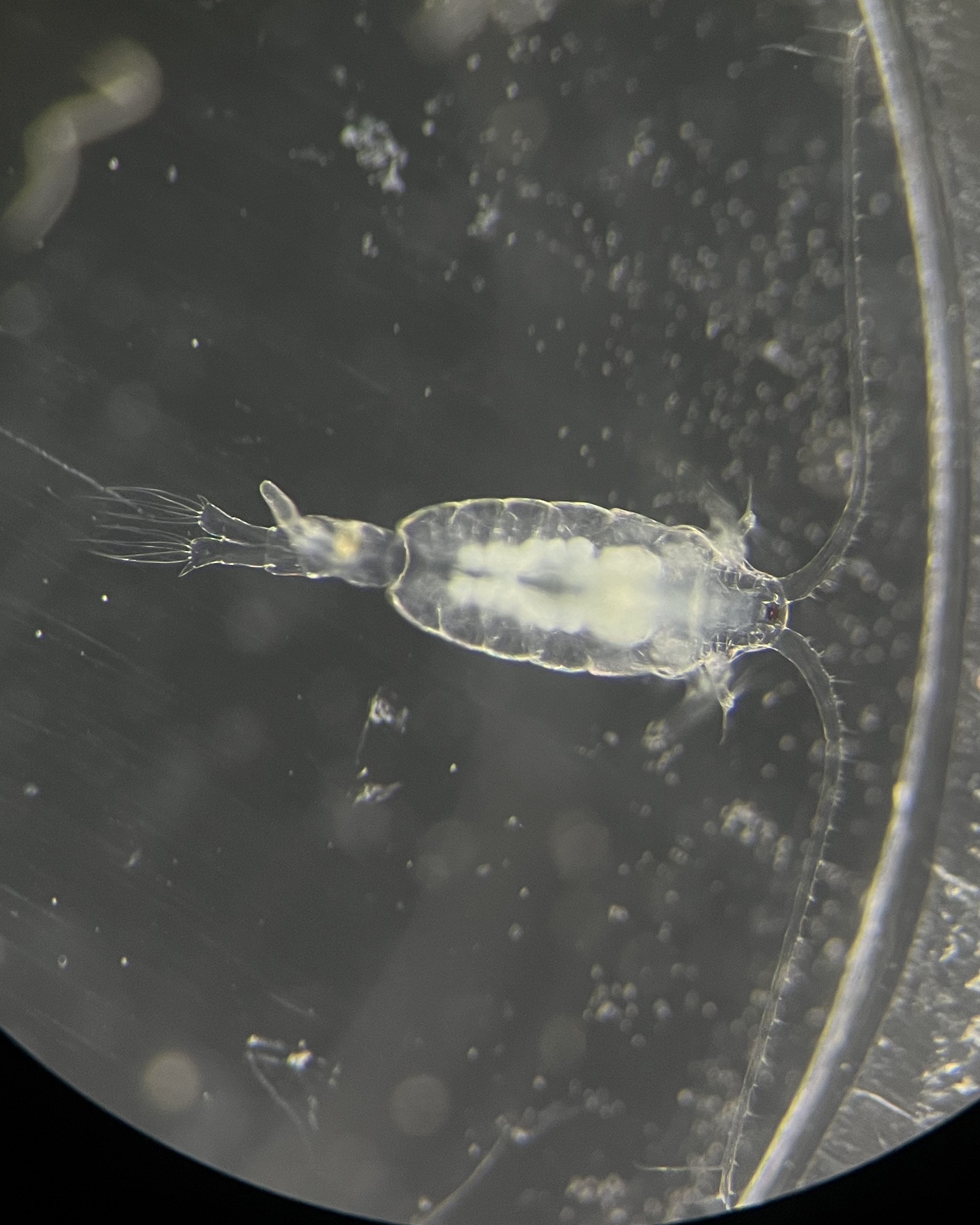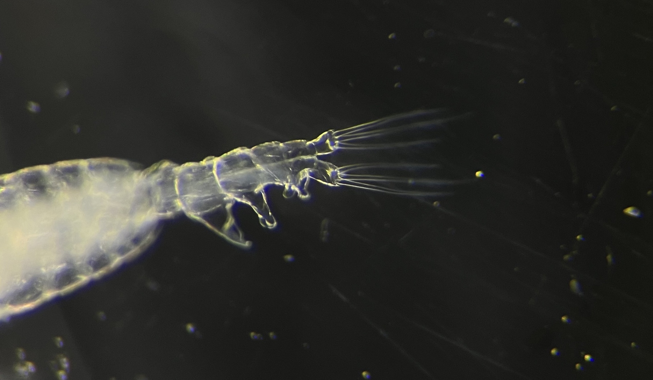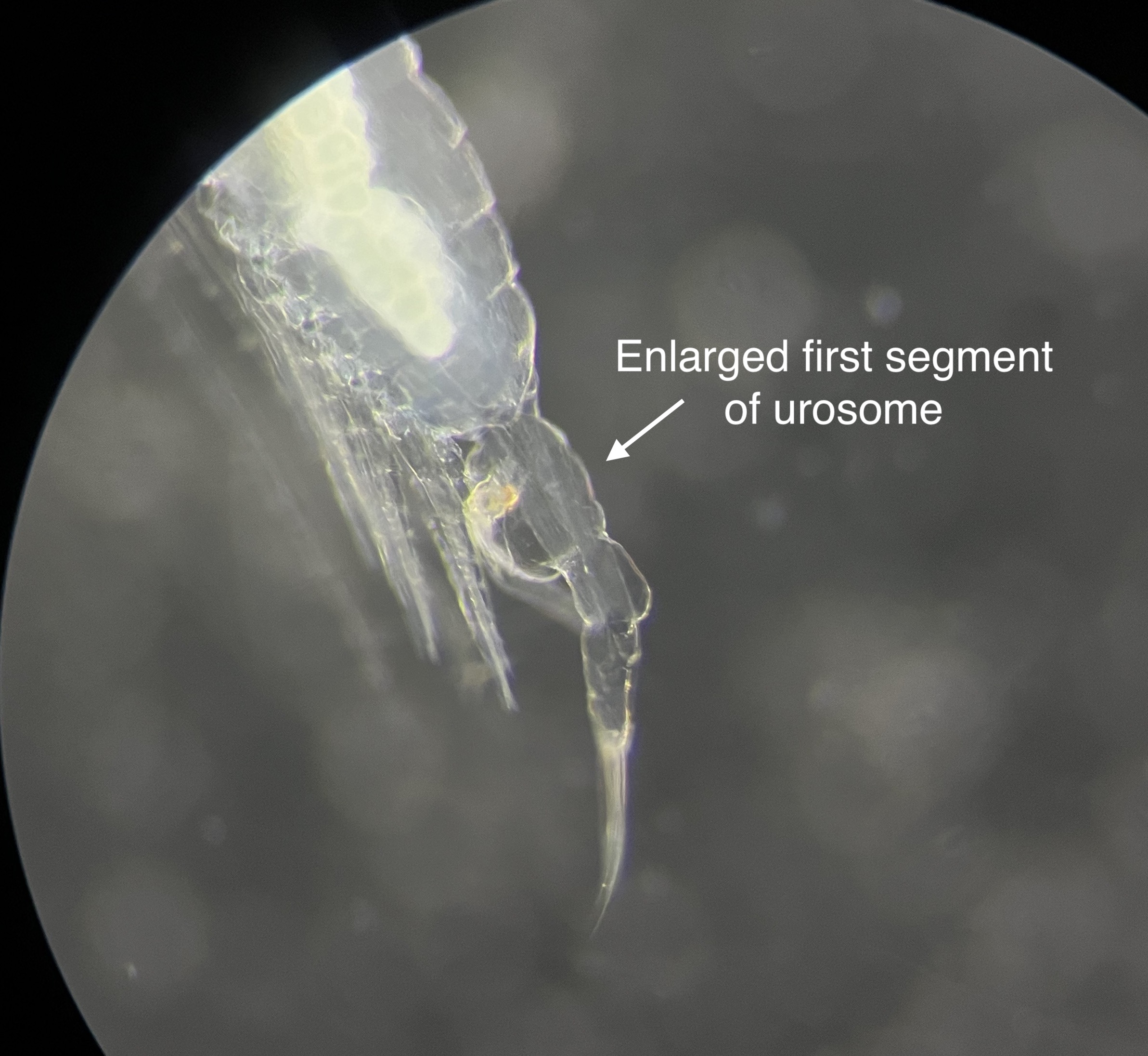 Note the large projections from one side of the urosome and the hinged antenulle. Unlike the other species found in this area, there are only three terminal setae on the urosome.