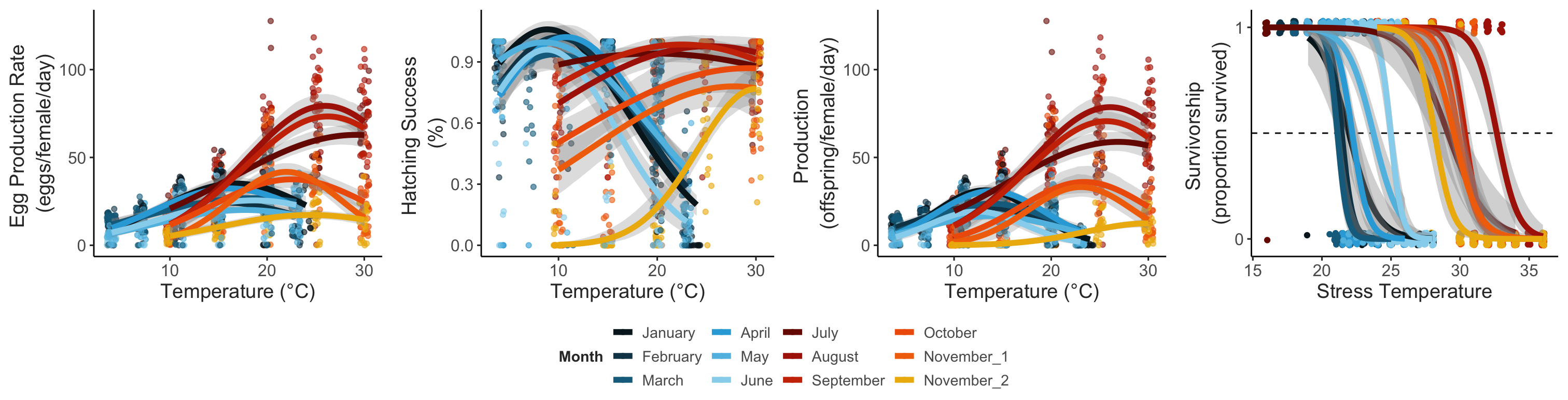 Another important dimension of organismal performance is reproductive success (the number and viability of offspring produced). As with respiration and body size, reproduction is strongly affected by temperature. This relationship tends to take on the shape of a classic thermal performance curve. Characterizing these curves can provide important insights about how organisms cope with variation in the thermal environment. In one past example, we characterized thermal performance curves for two different species of Acartia copepods, collected at multiple points throughout the annual temperature cycle. The curves show clearly that optimum temperatures, along with the maximum reproductive output, vary both between and within the two species. By linking physiological performance to population dynamics and ecological interactions, we can better predict the effects of heatwaves and other stochastic events.