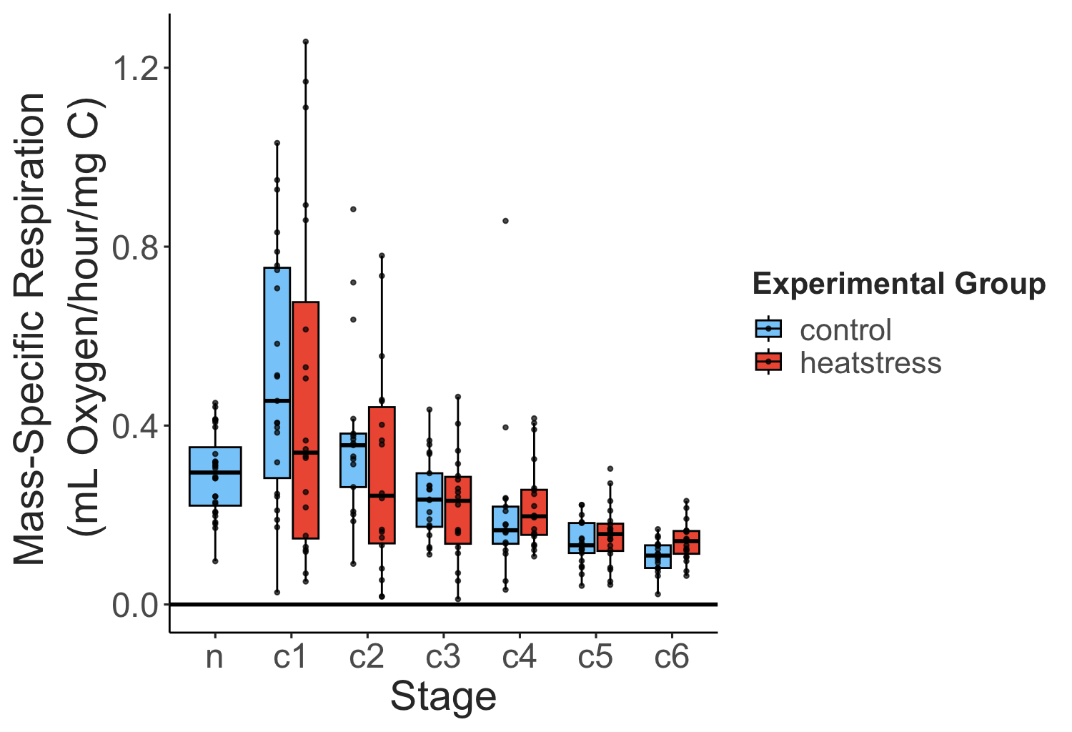 Despite their small size, we were able to measure the oxygen consumption of individual copepods, tracking their respiration rates as they passed through different life stages. As expected, the mass-specific respiration rate decreases as the individual gets larger. Interestingly, however, these patterns don’t seem to be affected by short term heat stress early in life, suggesting some degree of resilience to environmental variability.