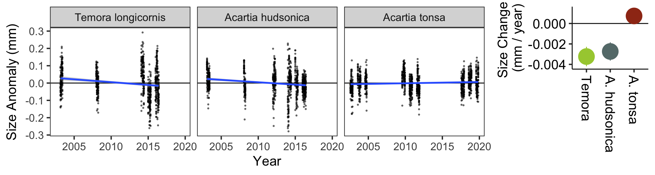 Body size is often related to important performance traits (respiration, reproductive output, feeding rates, etc.). Typically, we see smaller body sizes at higher temperatures. Because of their short generation times, this pattern can emerge even over seasonal timescales in temperate locations. In many cases, these locations are also subject to long-term warming, which might result in the gradual shrinkage of copepods over time. This would have important consequences for both food webs and biogeochemical cycles in these systems. Using a >20 year timeseries of monthly collections coordinated by CT DEEP we have been able to compare the seasonal and long-term patterns in copepod body size. Initial results suggest important differences between the cold- and warm-water dominant species.