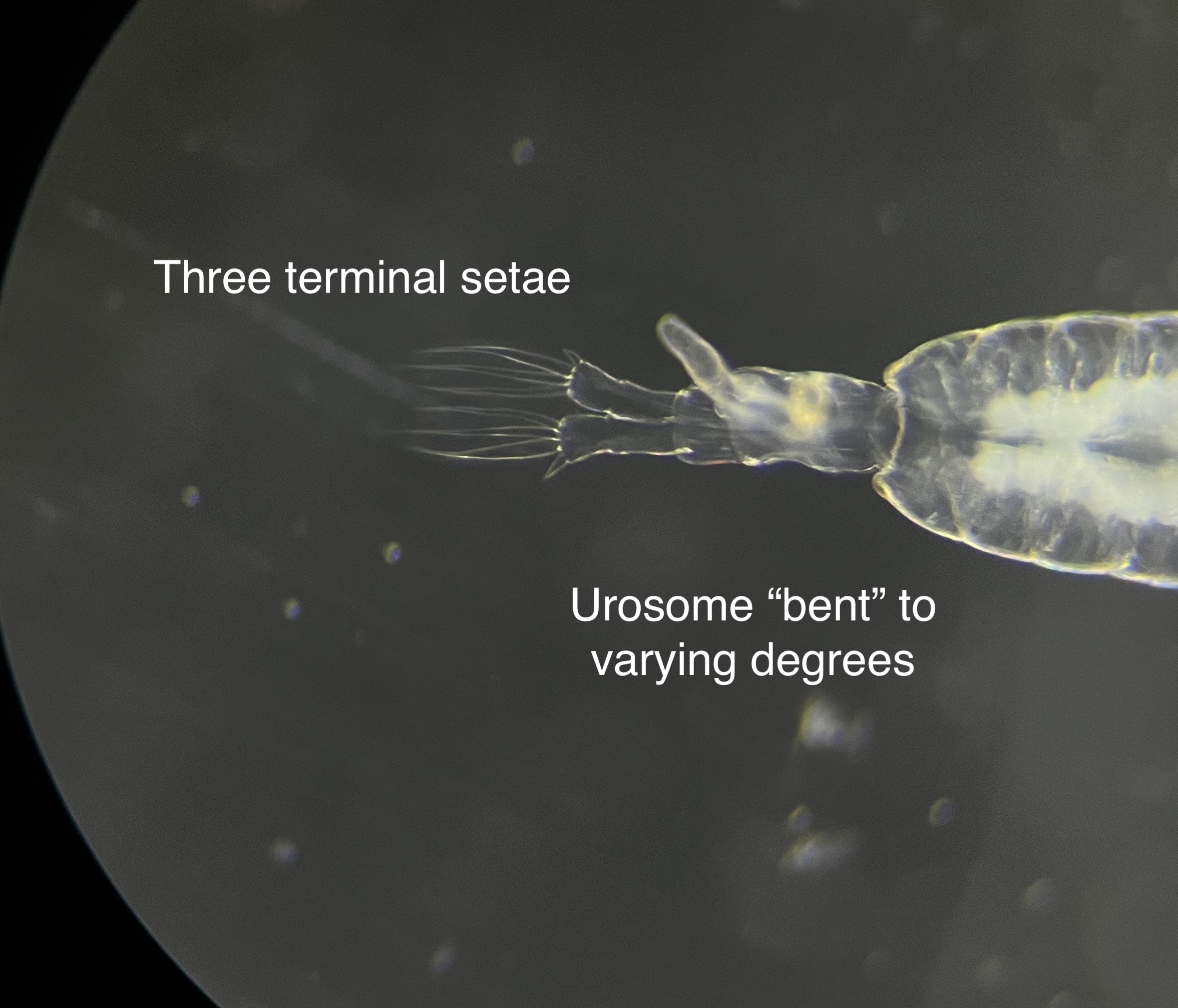 Note the large projections from one side of the urosome and the hinged antenulle. Unlike the other species found in this area, there are only three terminal setae on the urosome.